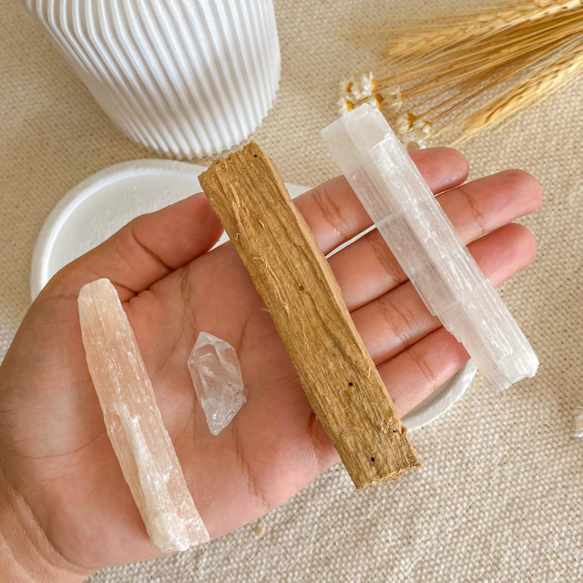 Incluso: Selenita Laranja, Selenita Branca, Ponta de Quartzo Natural e Lasca de Palo Santo In Natura. Acompanha também um saquinho de algodão para guardar seu Kit.