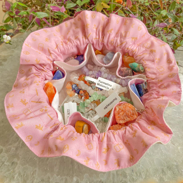 Esse mimo, é o nosso novo porta joias para ter nossos acessórios e cristais sempre por perto. Ideal para carregar na bolsa, mala de viagem ou mesmo organizar nossos acessórios em casa. Seu revestimento em microfibra com compartimentos evita que os cristais tenham atrito e eventualmente possam riscar ou mesmo quebrar.